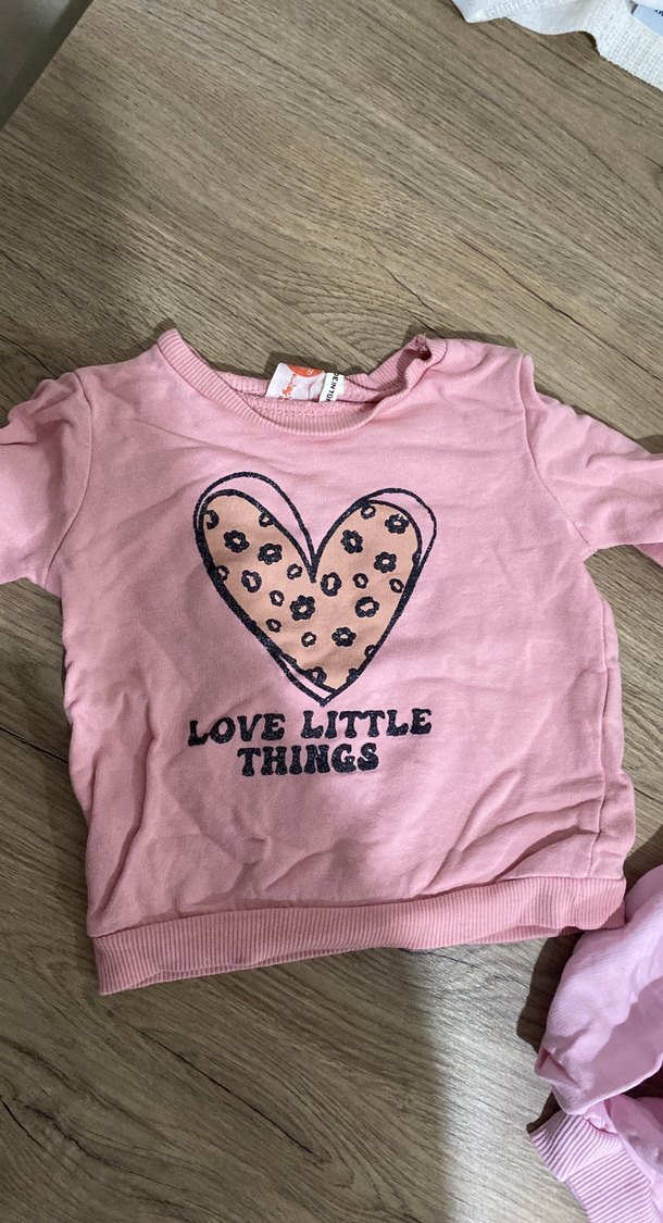 Pamuk pembe sweatshirt, bol kesim, uzun kollu ve yuvarlak yaka. Üzerinde "LOVE LITTLE THINGS" yazılı kalp baskısı bulunur. Trendy ve rahat bir seçenek. Hepsi toplam ücretidir