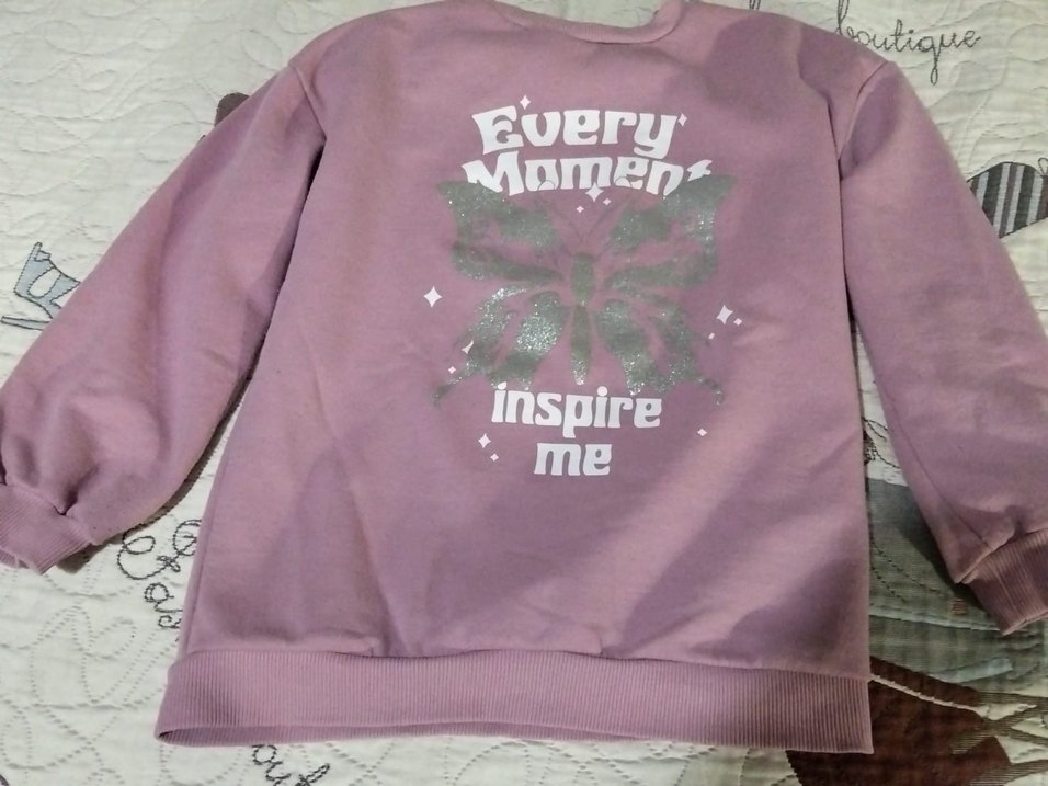 Mor renkli, bol kesim kız sweatshirtü, uzun kollu ve yuvarlak yaka. Üzerinde kelebek baskısı ve "Every Moment inspire me" yazısı bulunur.
