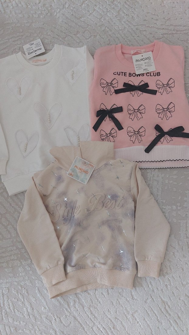 Pembe, uzun kollu, yuvarlak yaka, bol kesim kız sweatshirtü. Önünde baskılı fiyonklar ve "CUTE BOWS CLUB" yazısı bulunur. Pamuklu, örgü kumaştan yapılmıştır. birinin fiyatıdır. bedenleri mevcuttur.