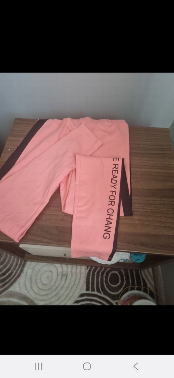 Pembe, baskılı ve elastik bel bantlı kız taytı. Yumuşak sentetik kumaştan üretilmiş, yan tarafında "E READY FOR CHANG" yazısı bulunur.