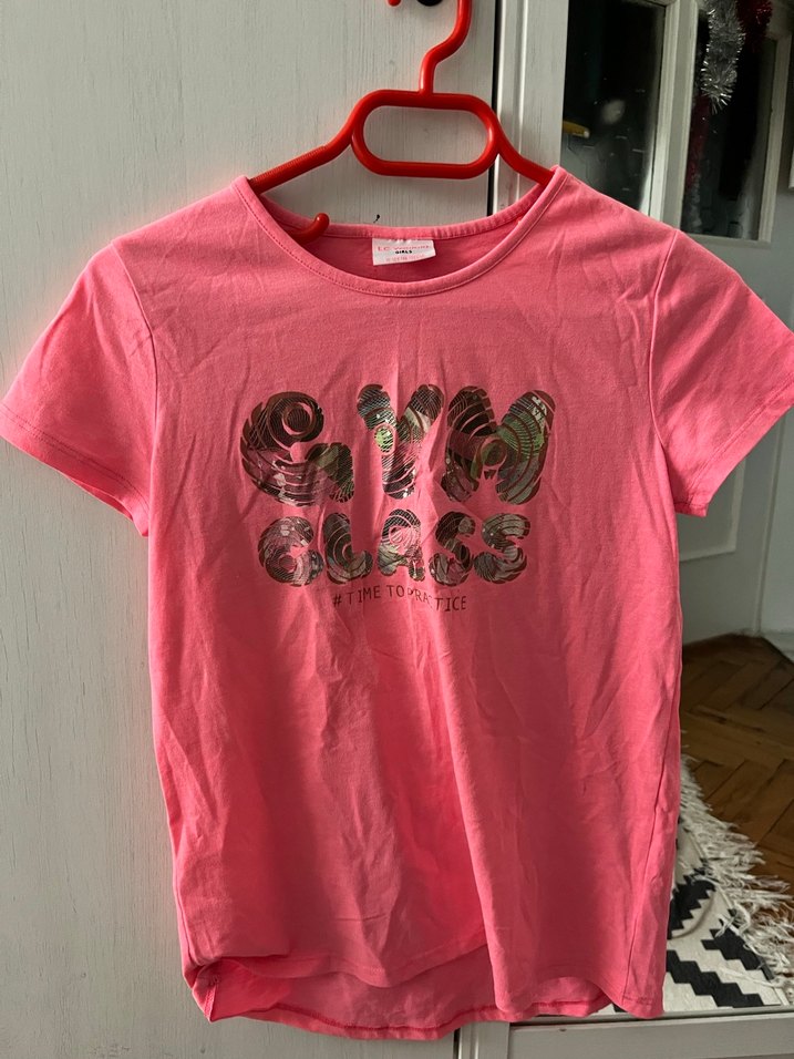 Pembe renkli, kısa kollu ve yuvarlak yakalı kız tişörtü, baskılı deseni ve rahat kesimiyle günlük sokak stili için uygundur. Birkaç kez kullanıldı. Temiz üründür.
