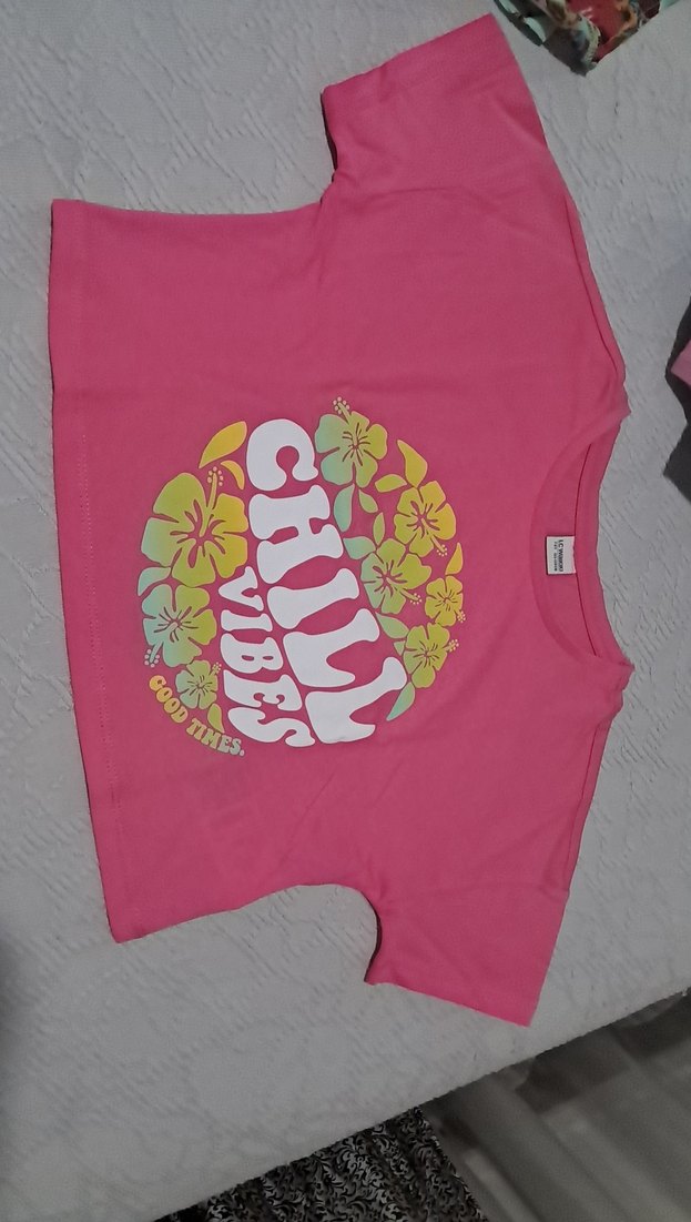 Pembe renk, kısa kollu, yuvarlak yakalı ve bol kesim kız tişörtü. Canlı baskılı desenle sentetik kumaştan üretilmiştir.