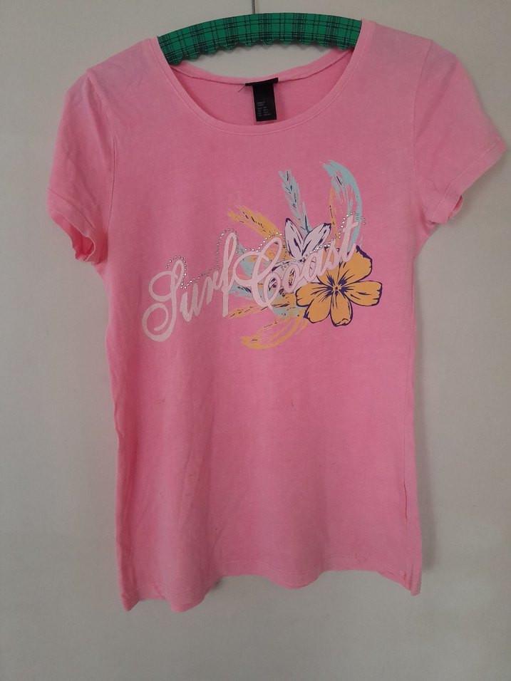 Pembe, kısa kollu, bol kesim kız tişörtü. Sentetik kumaştan, önünde baskılı çiçek deseni ve crew yaka bulunur. Streetwear tarzında.