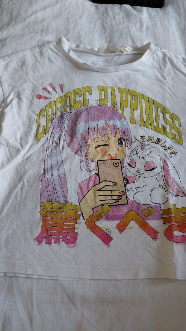 Pamuklu, kısa kollu, yuvarlak yakalı bol kesim kız tişörtü. Pastel pembe tonlarda baskılı anime tarzı desen ve canlı yazılar içerir.