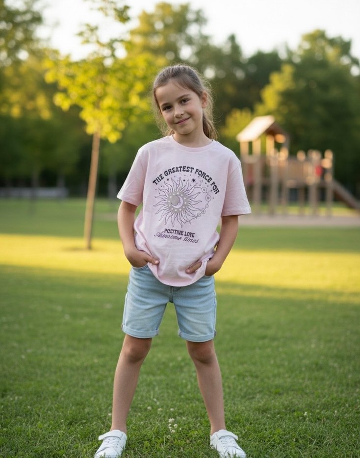 Pastel pembe renkli, kısa kollu ve baskılı tasarımlı kız tişörtü. Denim kumaştan, rahat kesim ve yuvarlak yaka ile günlük sokak stiline uygun.