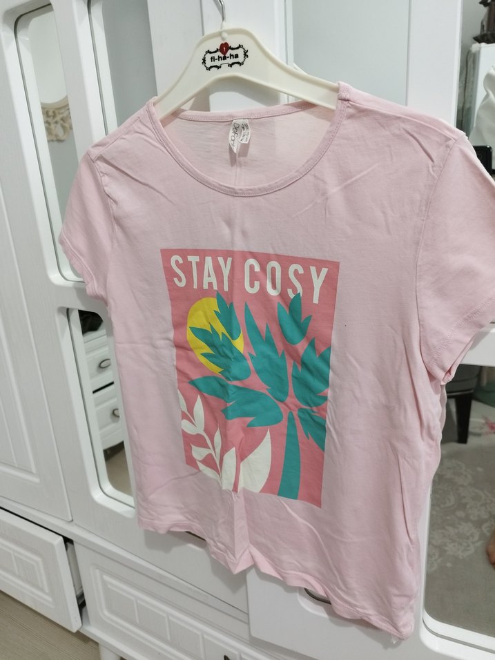 Pembe renkli, kısa kollu, salaş kesim kız tişörtü. "STAY COSY" yazılı baskısı ve renkli yaprak desenleri bulunur. Yumuşak sentetik kumaştan üretilmiştir.