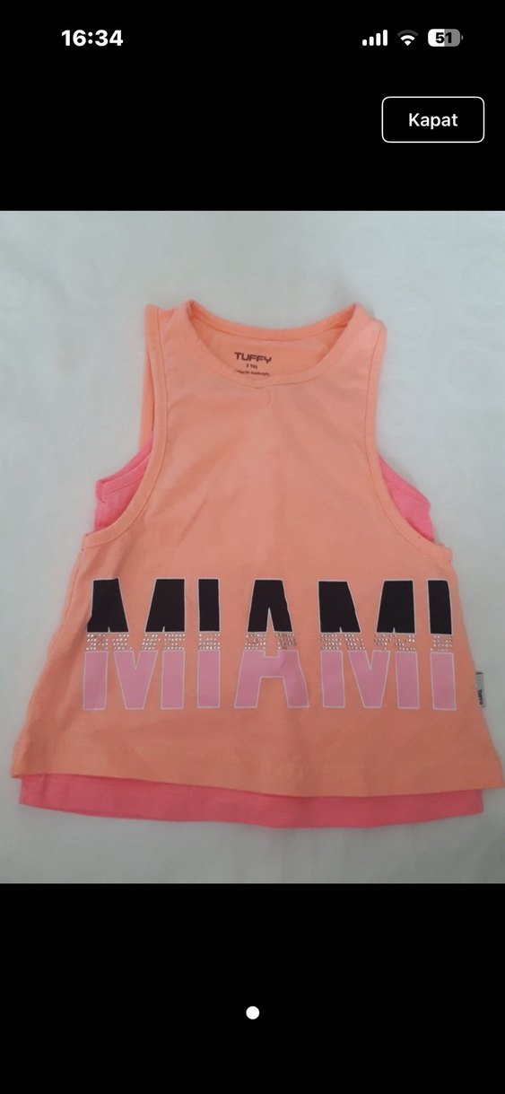 Pembe renkli, kolsuz ve straplez kesime sahip, baskılı 'MIAMI' yazılı kız yeleği, yumuşak sentetik kumaştan, trend sokak stiline uygun.