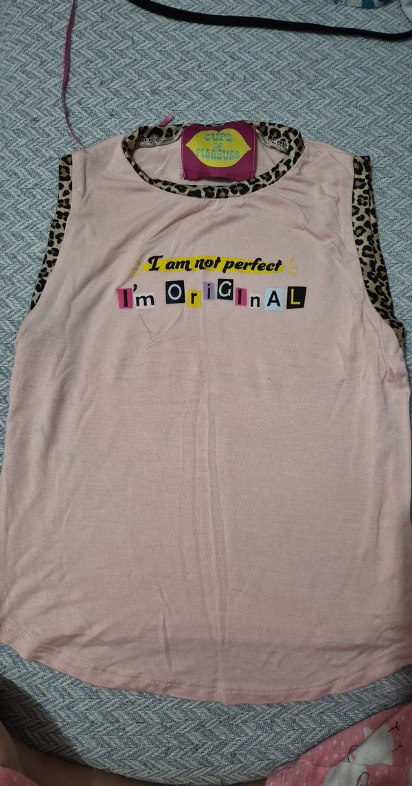 Pastel pembe renkte, kolsuz ve bol eopar desenli yuvarlak yaka detaylıdır. "I am not perfect I'm original" baskılıdır. Rahat ve şık bir görünüm sunar.