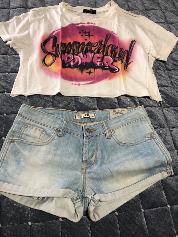 Pembe baskılı, rahat kesim mini denim şort. Parti için uygun, zahmetsiz şıklık sunar. Bershka ve ltb -xs(12/13yaşa da uyar)
