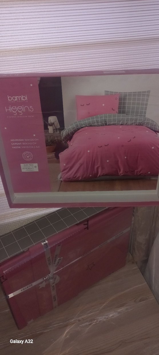 Bu nevresim takımı, pembe zemin üzerine baskılı desenler ve gri kareli detaylarla modern ve rahat bir görünüm sunar.