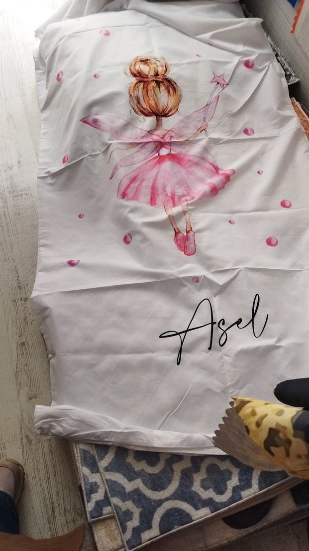 Pastel pembe renkte, baskılı balerin figürü ve 'Asel' ismi bulunan yumuşak sentetik kumaştan çocuk nevresim ve yastık kılıfı.