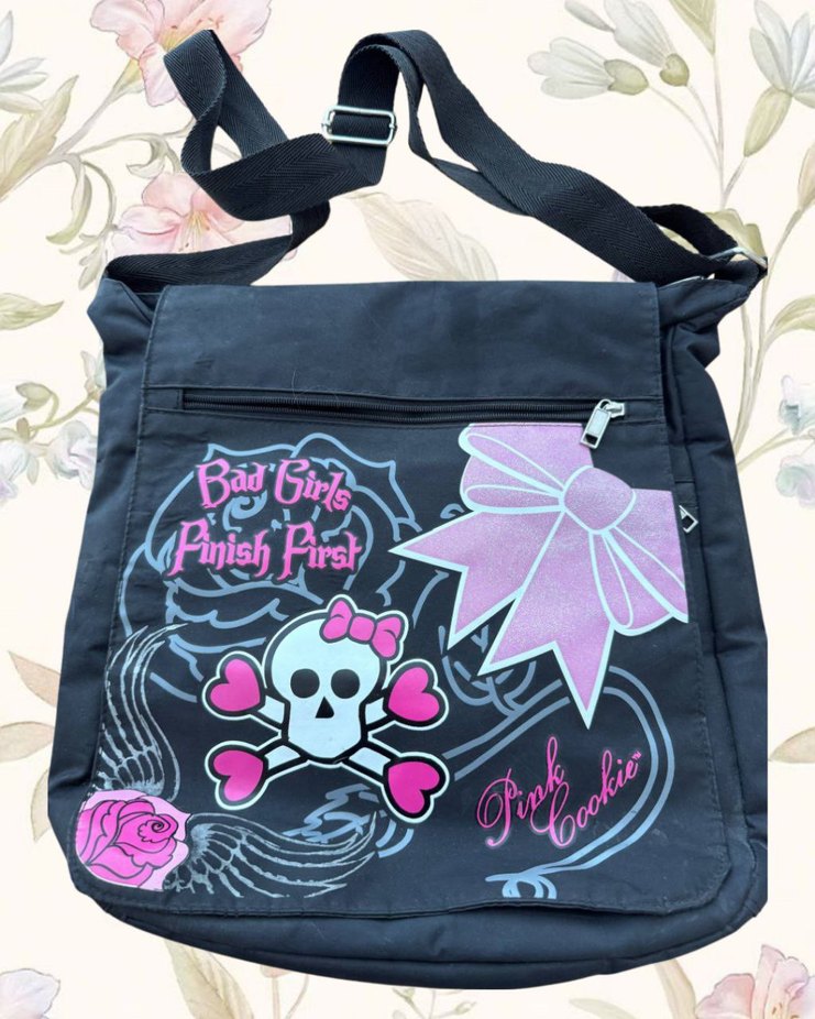 Ayarlanabilir askılı, fermuarlı ön cepli koyu pembe baskılı bebek çantası. Kafatası, fiyonk ve kalp desenleri içerir.