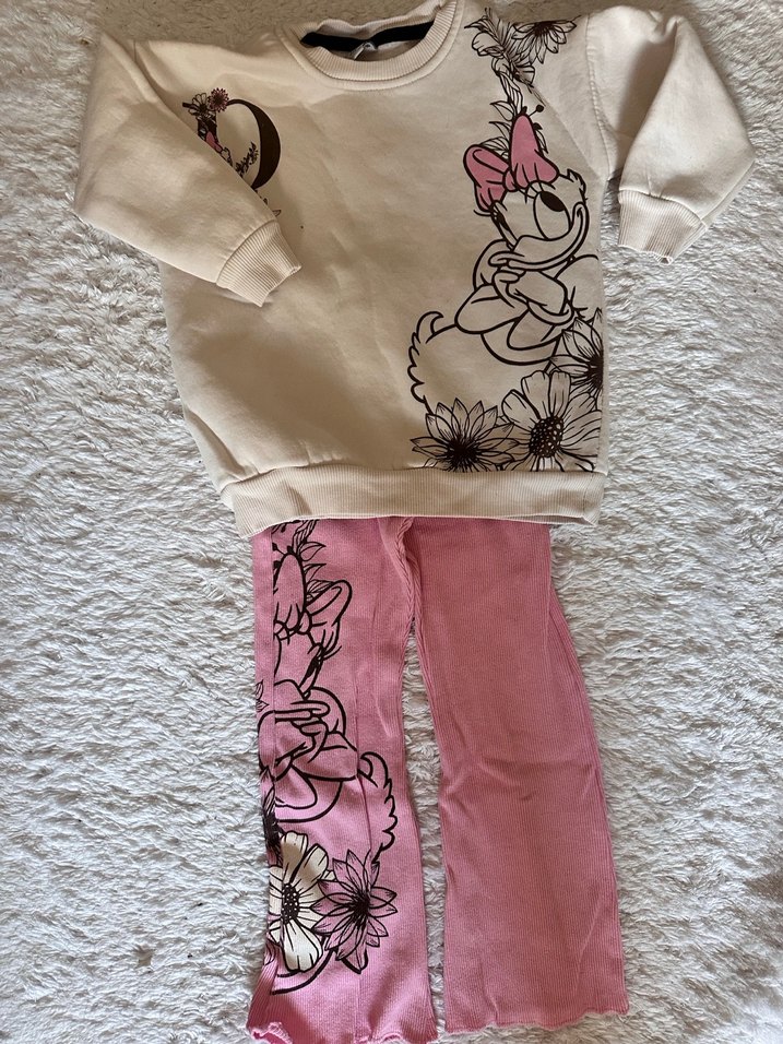 Dolabımdaki çocuk ürünlerinin hepsini toplu almak isteyen olursa 2000 liraya vereceğim. Örgü uzun kollu üst ve çiçekli, baskılı pembe pantolondan oluşan bebek kız takımı.