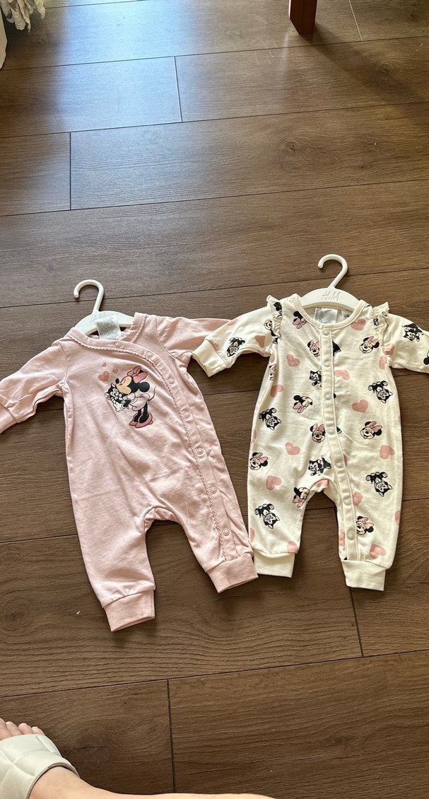 HİÇ KULLANILMADI Pastel pembe renkli, baskılı Minnie Mouse desenli örgü bebek tulumları. Yumuşak ve rahat kumaştan üretilmiştir.
