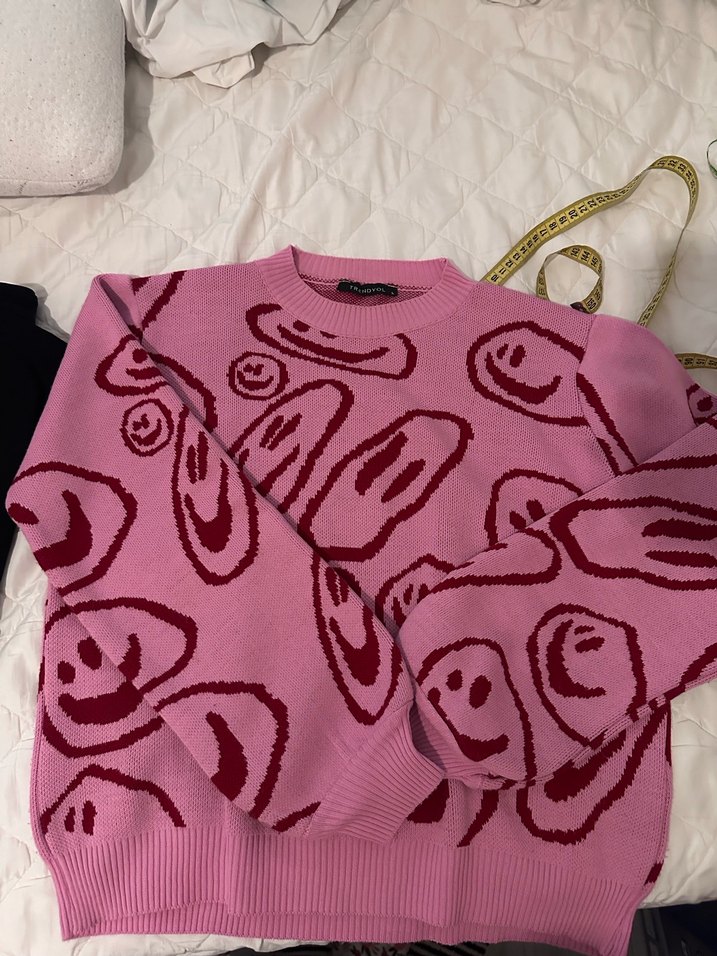 Pembe renkli, örgü kumaştan, baskılı gülen yüz desenli, bol kesim uzun kollu kadın kazak. Günlük rahat ve şık sokak stili için uygun.