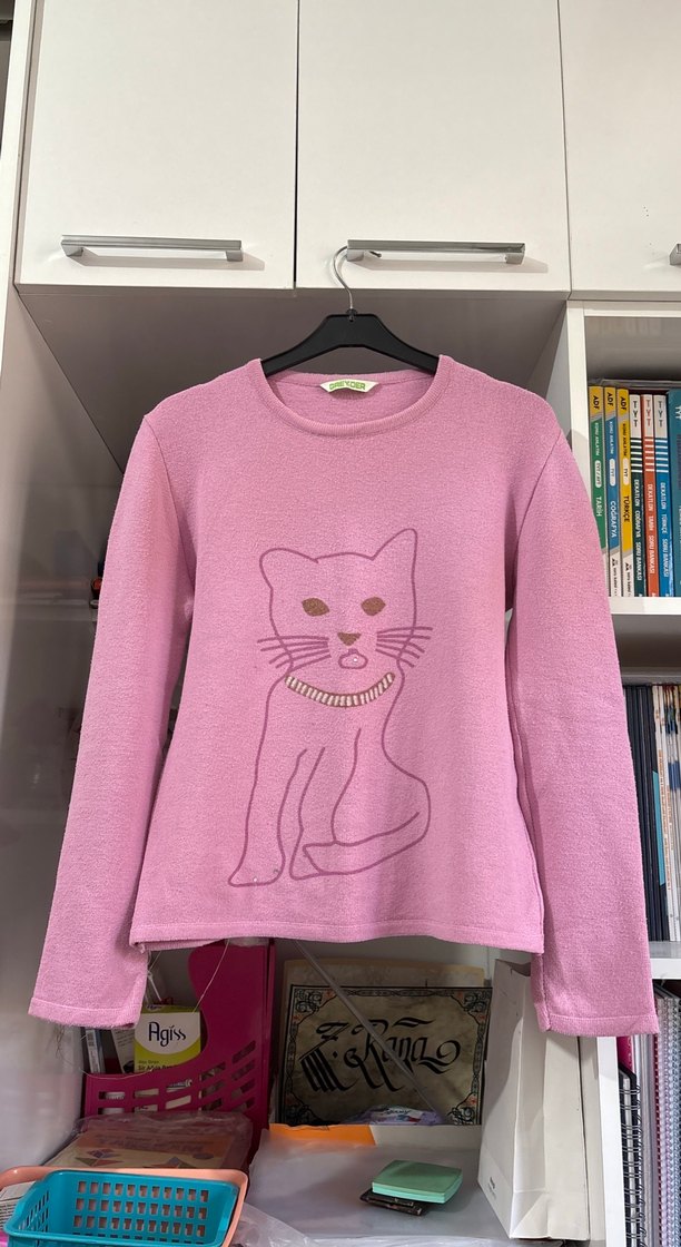 Pastel pembe renkli, örgü dokulu, önünde baskılı kedi deseni bulunan normcore tarzı kedi kazak.