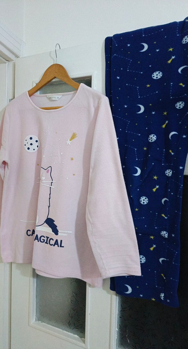 Pastel pembe renkli, örme kumaştan yapılmış, baskılı sihirli kedi ve ay desenli rahat kedi kıyafeti.