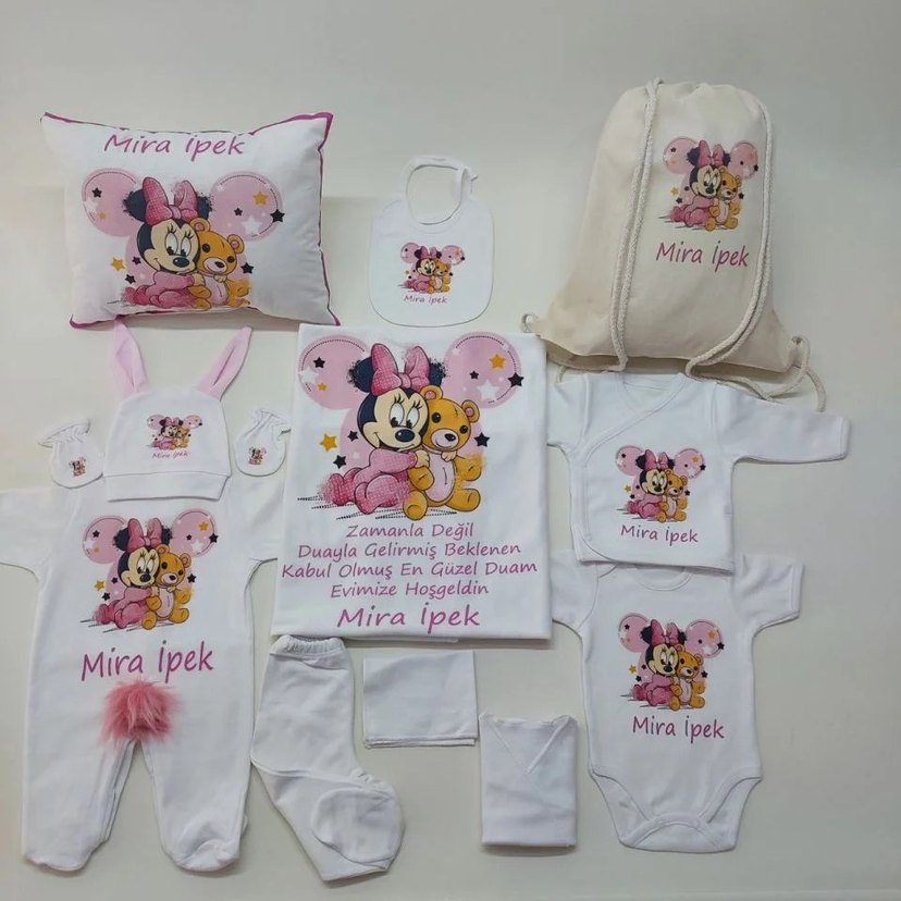 Pastel pembe pamuklu bebek uyku seti, yastık, önlük, tulum, çorap ve bağcıklı çanta içerir. Üzerinde sevimli baskılar ve Mira İpek ismi bulunur. isme özel sipariş olarak verebilirsiniz hazırlama süresi ile kargo 10 gündür