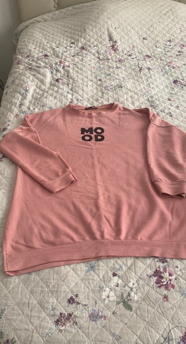 Pastel pembe renkte, uzun kollu ve bisiklet yaka pamuklu sweatshirt. Önde 'MOOD' baskısı bulunur, rahat ve salaş kesimlidir.