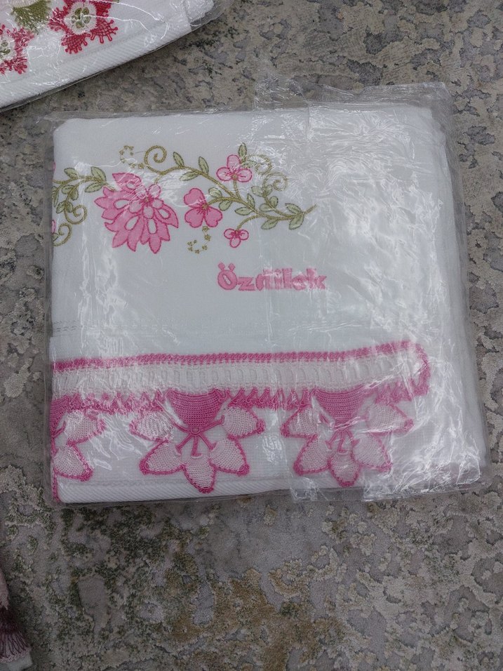Pastel pembe renkte, baskılı çiçek desenli ve kenarında işlemeli detaylar bulunan klasik tarzda yumuşak havlu.