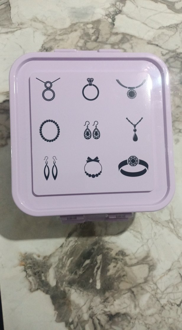 Pastel pembe renkte, kapağında takı desenleri bulunan plastik kutu, küçük aksesuarlar için kullanışlıdır.