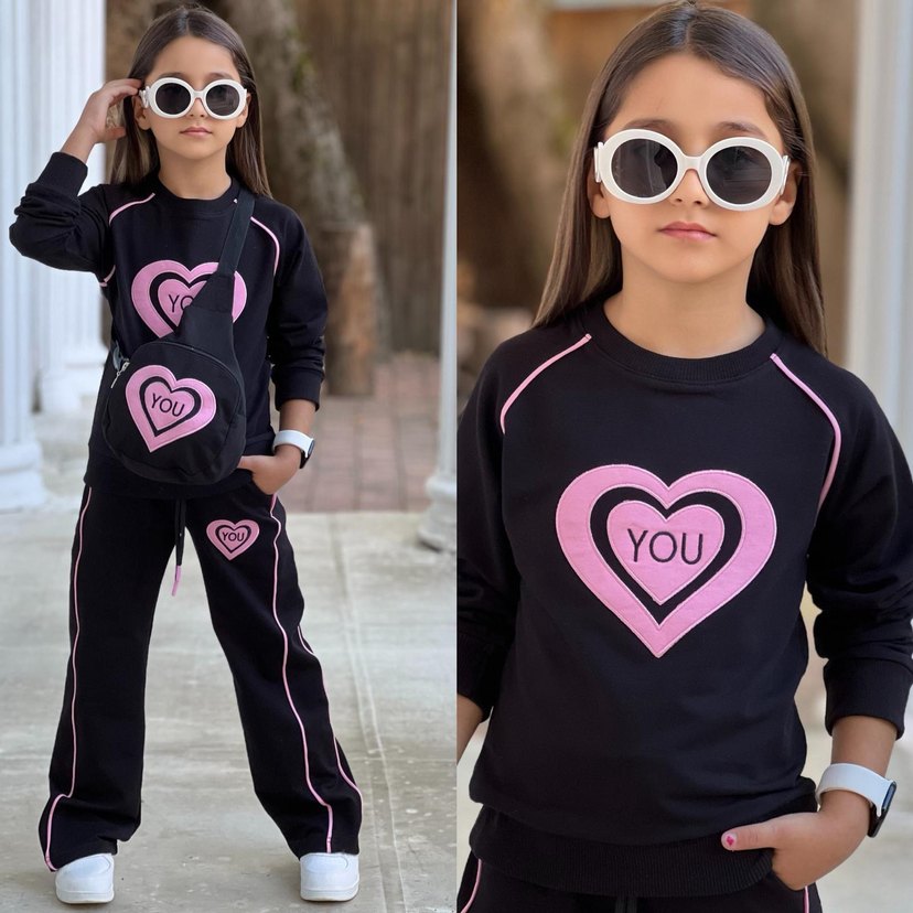 Uzun kollu, yuvarlak yakalı bol kesim kız eşofman takımı, yumuşak ve sıcak kumaş üzerinde koyu pembe baskılı kalp ve pul detayları içerir. ✨Çantasıyla birlikte 3 lu takım halindedir 5-6 yaş