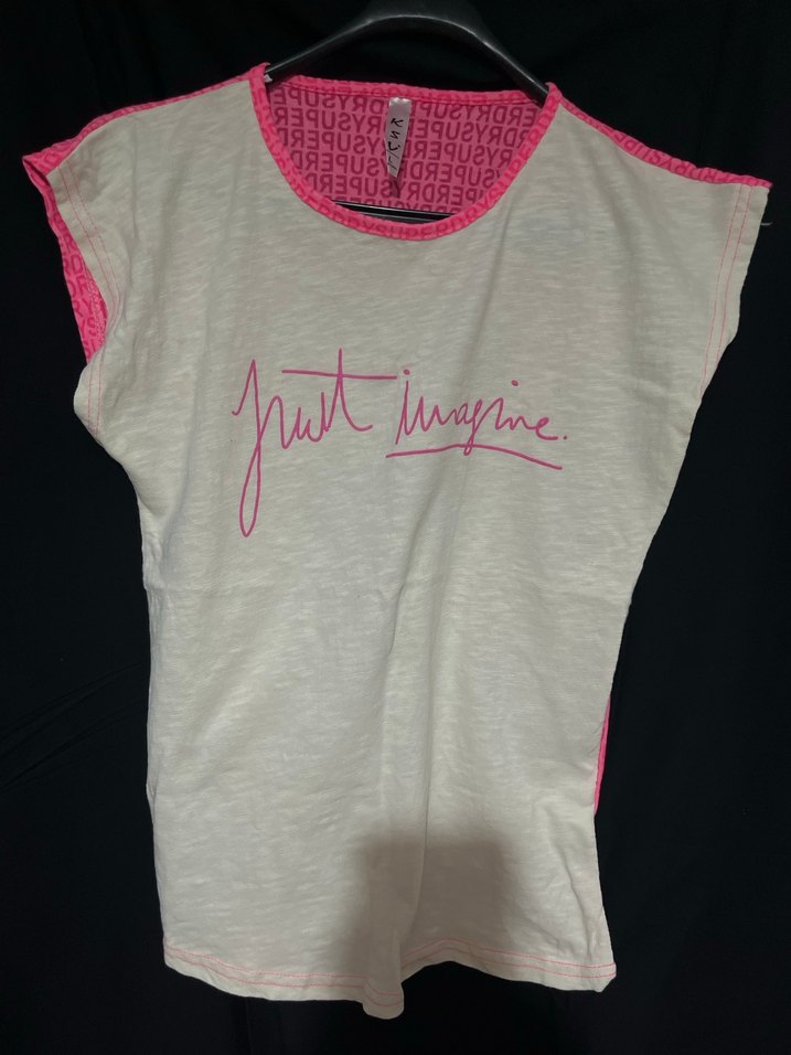 Hafif pembe renkli, baskılı, kısa kollu, salaş kesim tişört. Sentetik yumuşak kumaştan, yuvarlak yakalı, sokak modası tarzında.
