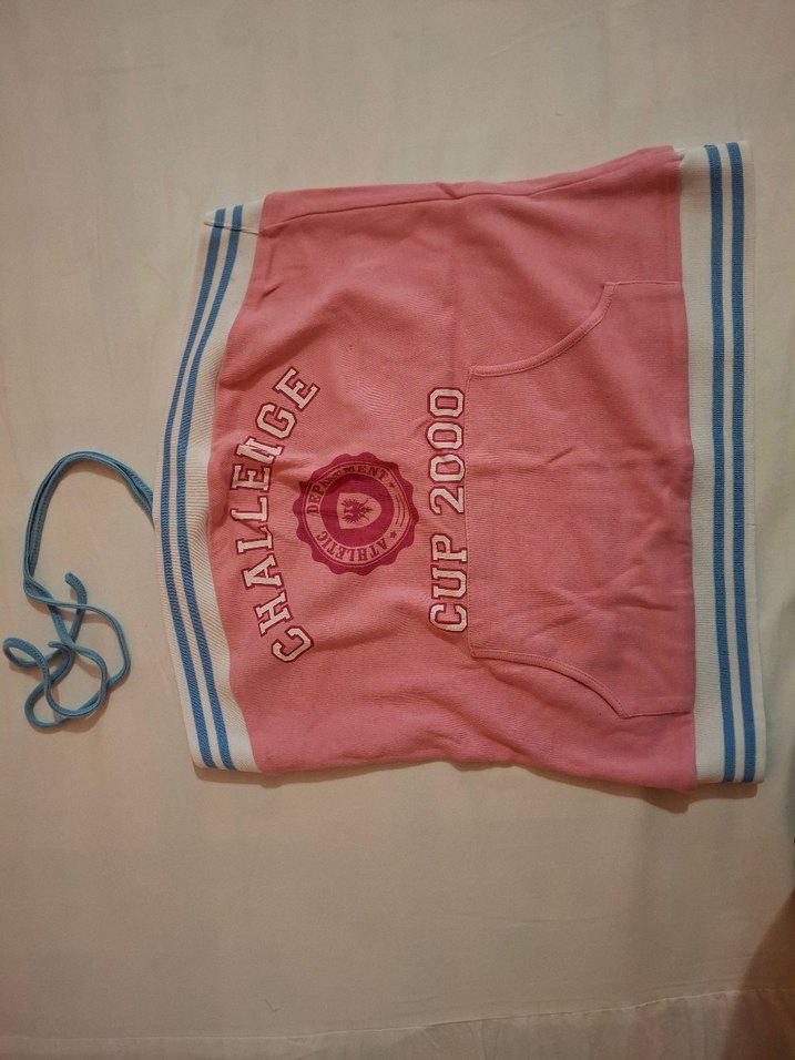 Mavi çizgili kenarları ve ön cebinde baskılı yazılar bulunan pastel pembe ayarlanabilir boyun askılı.