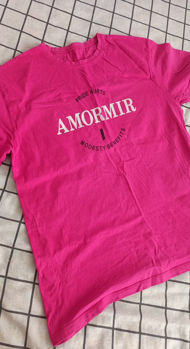 Pembe parlak pamuk tişört, kısa kollu ve bisiklet yaka. Rahat kesimli ve önünde "AMORMIR" baskısı bulunur, romantik akşamlar için uygun.