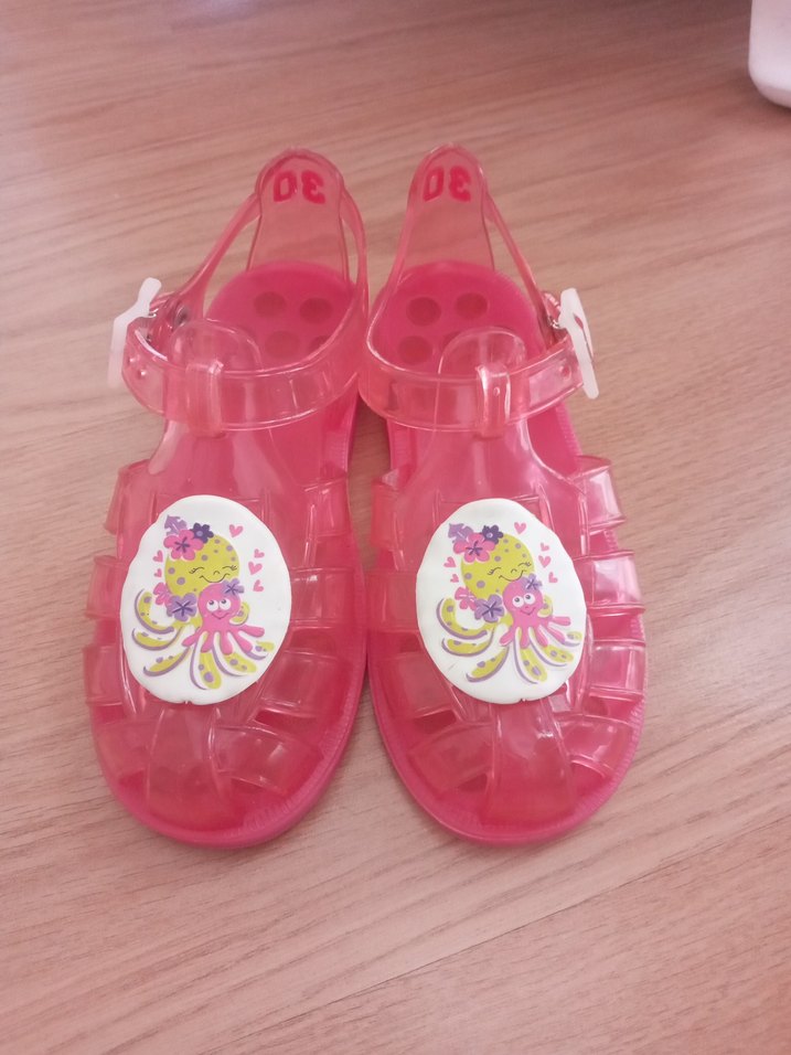 Renkli pembe, tokalı ve baskılı kız çocuk sandaletleri. Kauçuk malzemeden yapılmıştır, pop kültür tarzında.