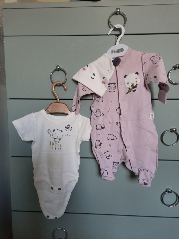 Bu mor bebek kıyafet seti, baskılı uzun kollu düğmeli tulum ve sevimli tasarımlı beyaz kısa kollu body içerir. 2.foto hepsi yeni hiç kullanılmamış 1 şapka, 3 çorap ve 3 eldiven
