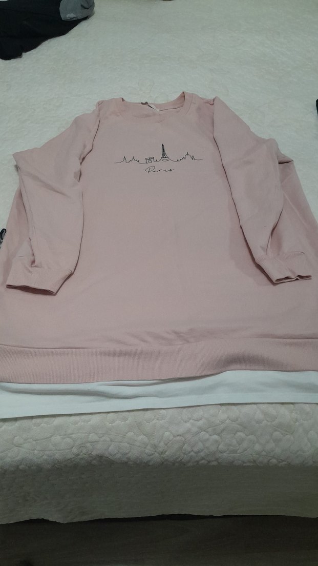 Pamuk kumaştan yapılmış, uzun kol ve bol kesim pembe sweatshirt, baskılı yuvarlak yaka ile günlük rahat kullanım için uygundur.