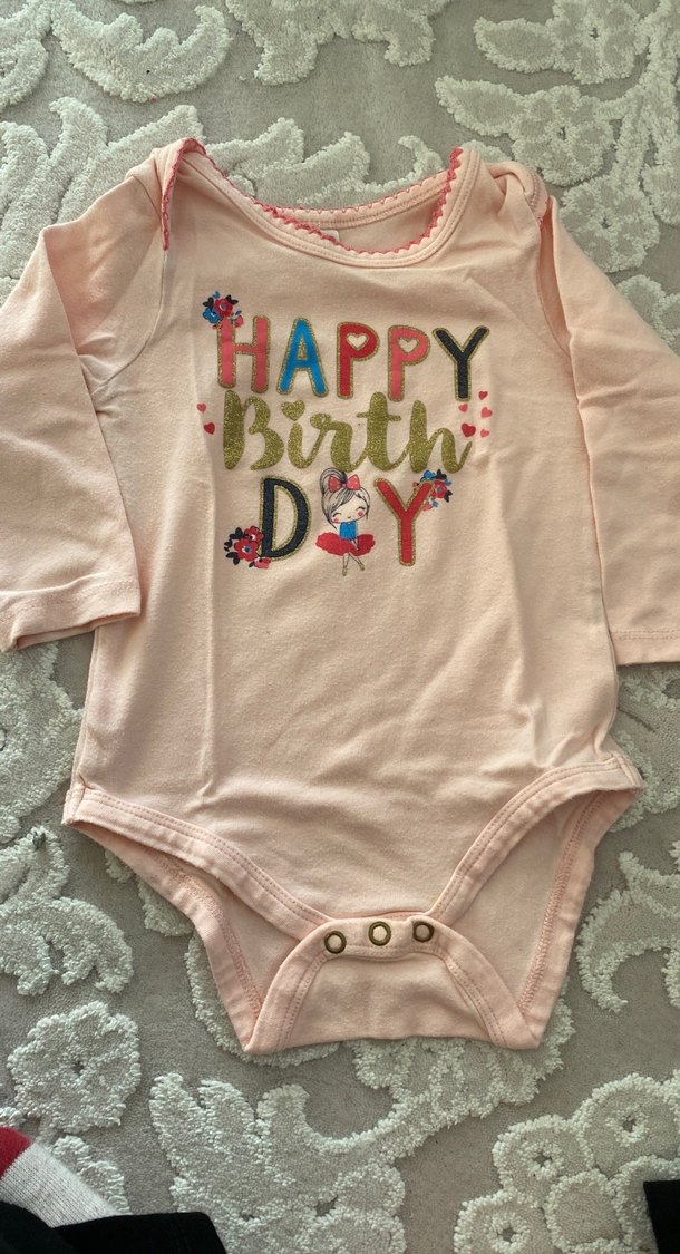 Pembe renkli, uzun kollu bebek body, yuvarlak yaka ve düğmeli kapanışa sahiptir. Önünde renkli 'Happy Birthday' baskısı vardır.