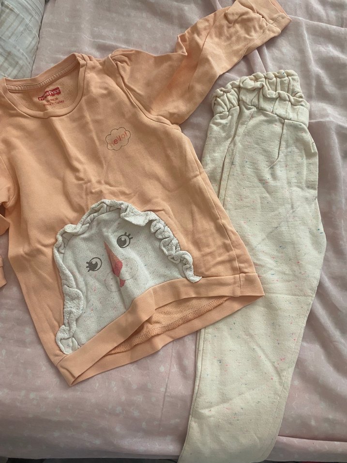 Pastel pembe tonlarında, baskılı uzun kollu üst ve rahat pantolondan oluşan bebek kıyafet takımı. Rahat ve şık bir görünüm sunar.