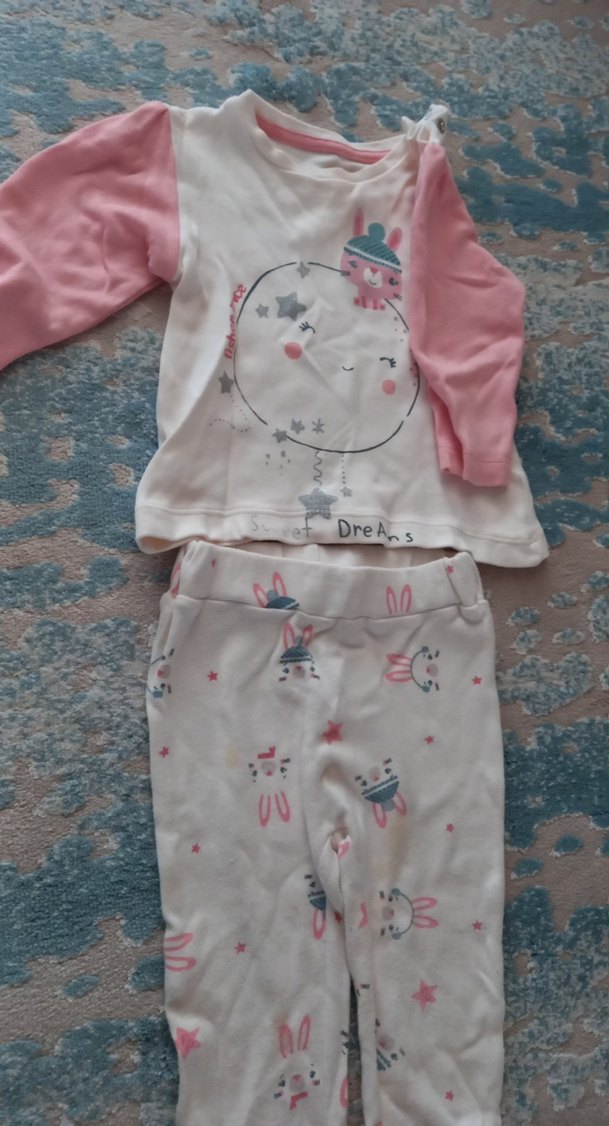 Pembe kollu uzun kollu üst ve baskılı pantolondan oluşan bebek kıyafet takımı, yumuşak ve rahat kumaş sunar.