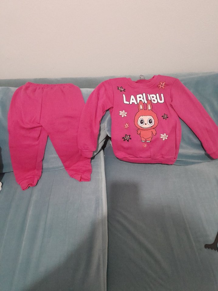 Pembe renkli, uzun kollu ve baskılı üst ile uyumlu pantolon içeren örgü bebek kıyafet takımı. Üstte 'LARIBU' yazısı ve sevimli karakter ile çiçek detayları bulunur.