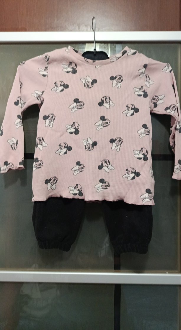 Bebek kız için pastel pembe renkli, baskılı ve örme uzun kollu üst ile siyah pantolon takımı.