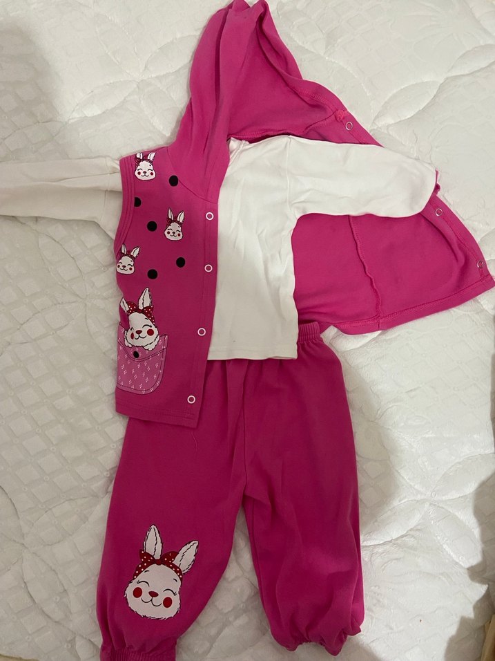 Hiç giyilmedi. Renkli pembe uzun kollu bebek kız takımı, düğmeli ön kısmı ve eğlenceli baskılı desenleriyle. Yumuşak ve rahat kumaş.