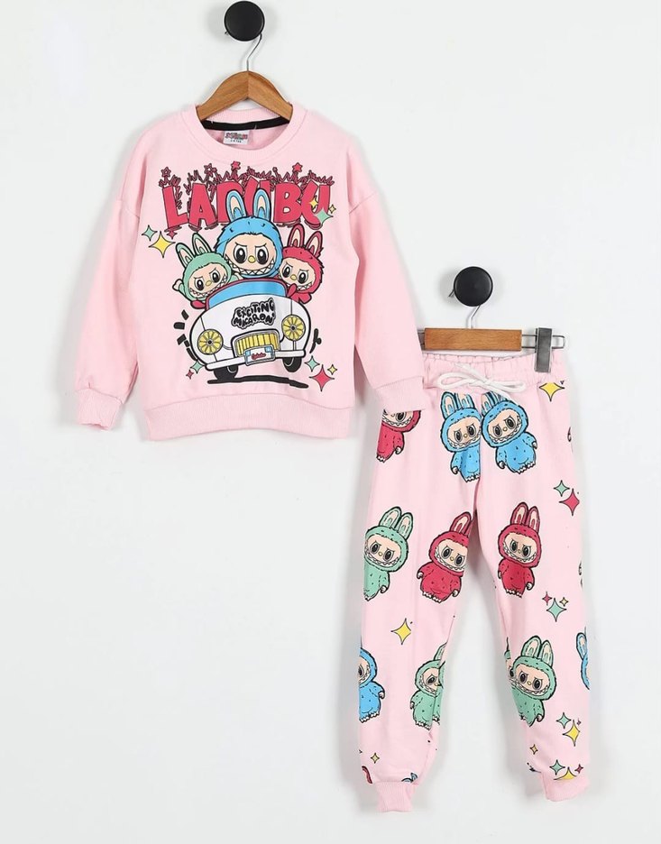 Pastel pembe renkte, uzun kollu ve yumuşak örme kumaştan yapılmış bebek kız takımıdır. Üst ve pantolonda renkli baskılı karakterler bulunur. 3 ,10 yaş