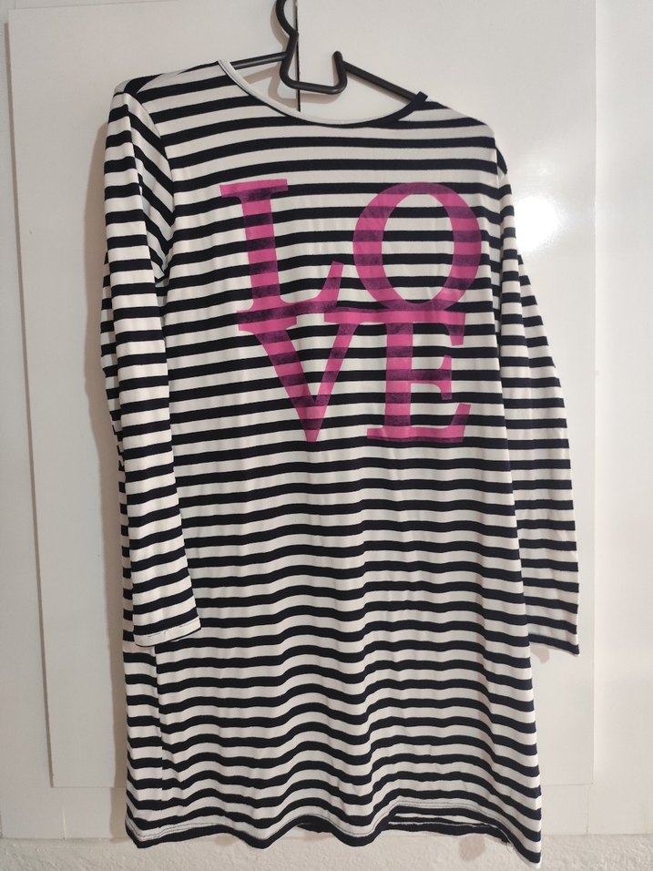 Uzun kollu, yuvarlak yakalı, siyah-beyaz çizgili ve pembe 'LOVE' baskılı bol kesim hamile tişörtü. Günlük kullanım için uygundur. baskısında biraz siliklesme mevcut