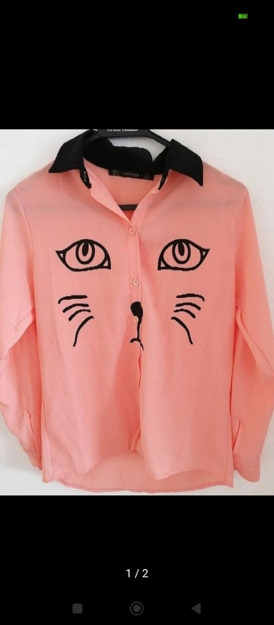 Pembe pastel renkli, siyah yakalı, düğmeli ve baskılı kedi yüzü desenli, bol kesim uzun kollu kadın gömleği. Orta uzunlukta, yumuşak sentetik kumaştan yapılmıştır.