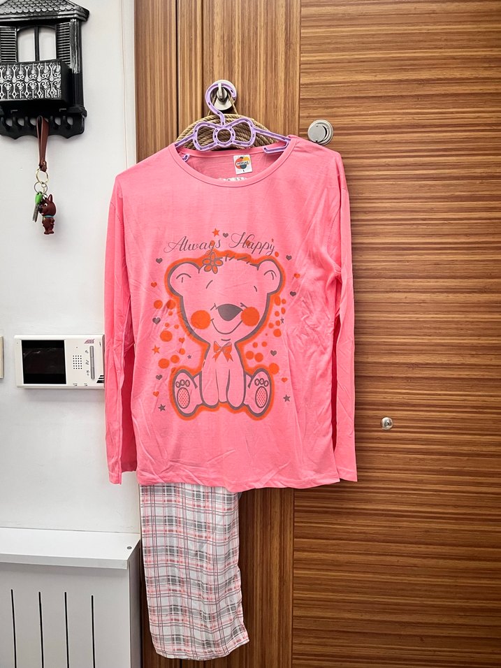 Pembe renkli, uzun kollu ve bol kesim kadın pijama takımı. Üstte renkli baskılı mutlu ayıcık deseni, altta kareli desenli rahat pantolon bulunur.