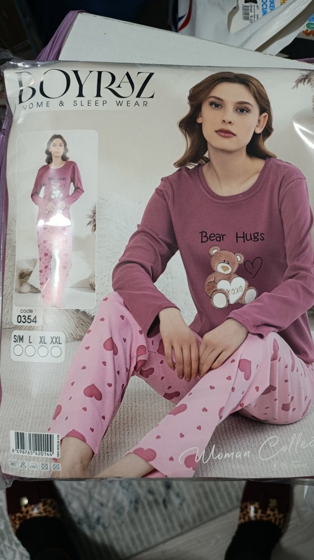 Boyraz markasına ait, uzun kollu, normal boyda, pembe ve kalp desenli baskılı kadın pijama takımı. Üstte ayıcık ve "Bear Hugs" yazısı bulunur. M L XL XXL bedenler