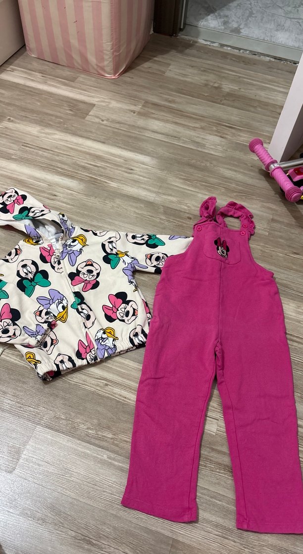 Bu kız bebek takımı, fermuarlı renkli baskılı uzun kollu üst ve Minnie Mouse desenli pembe tulumdan oluşur. Rahat ve şık bir seçim.