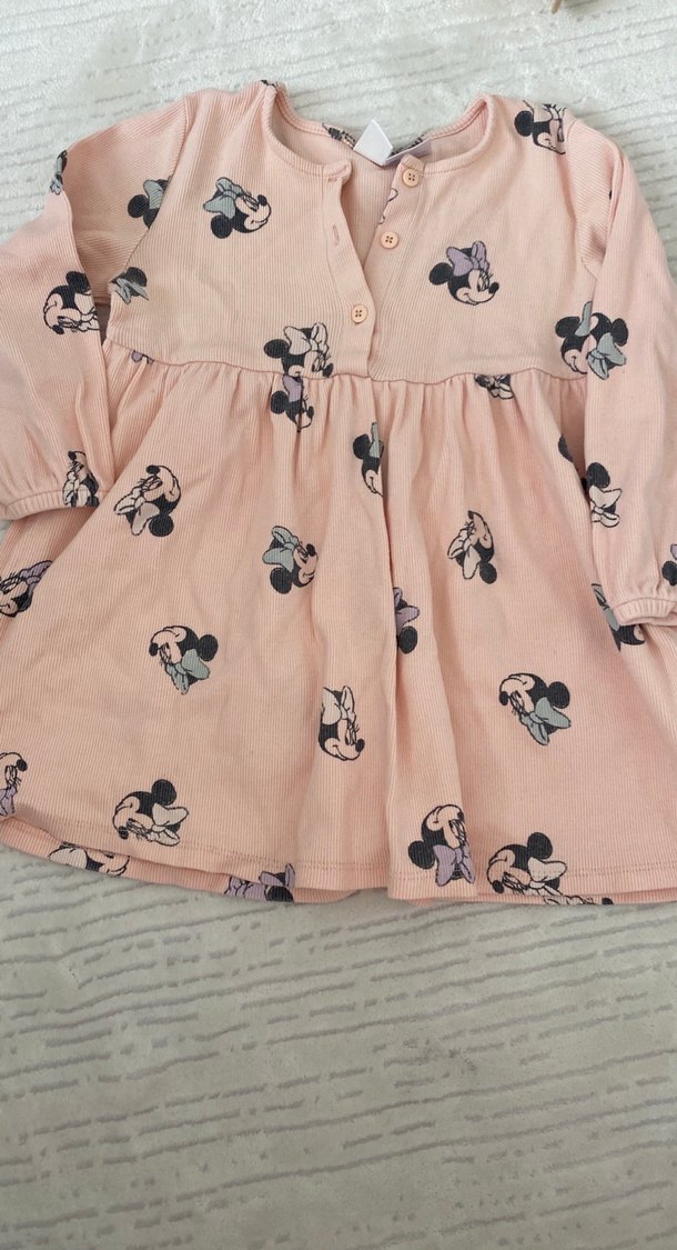 Pembe pastel tonlarında, uzun kollu, düğmeli ve baskılı desenli kız elbisesi. Rahat kesimli ve yuvarlak yakalıdır.
