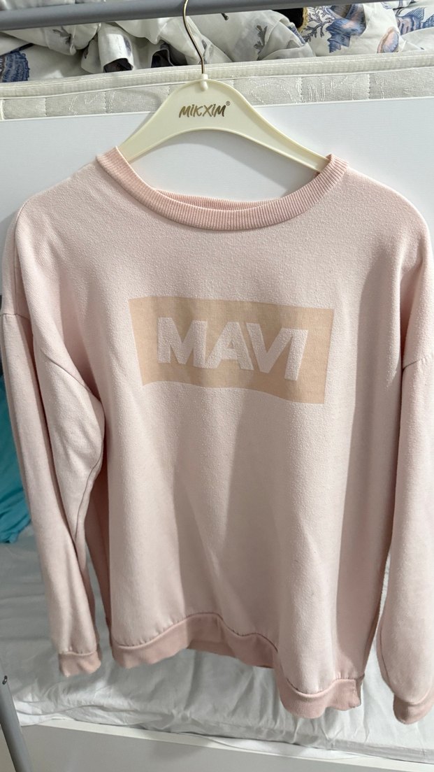 Pembe renk, uzun kollu ve yuvarlak yakalı, rahat kesim, MAVI baskılı örme kumaş sweatshirt.