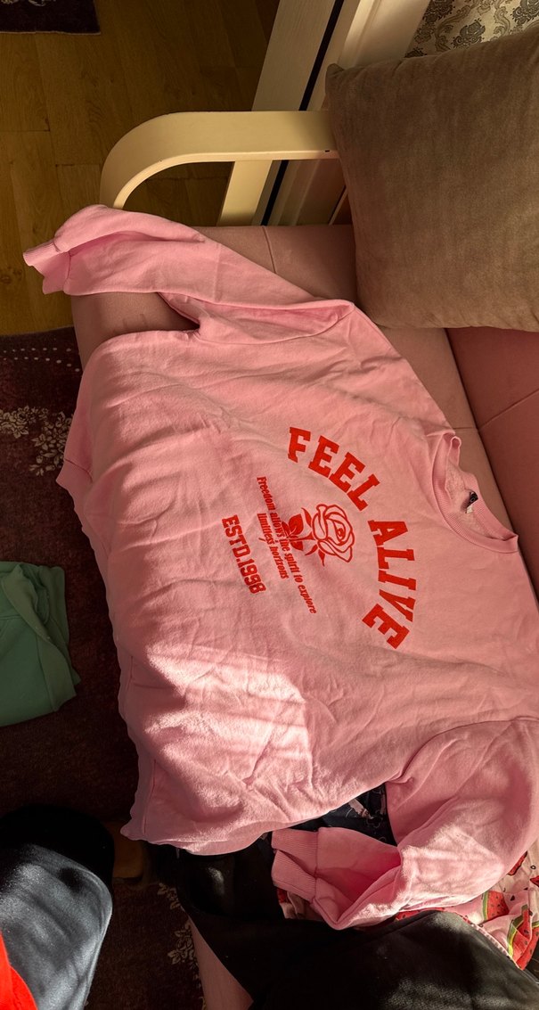 Pastel pembe, uzun kollu ve yuvarlak yaka hamile tişörtü, salaş kesim ve baskılı detaylara sahiptir. Yumuşak ve sıcak kumaştan üretilmiştir, günlük kullanım için uygundur.