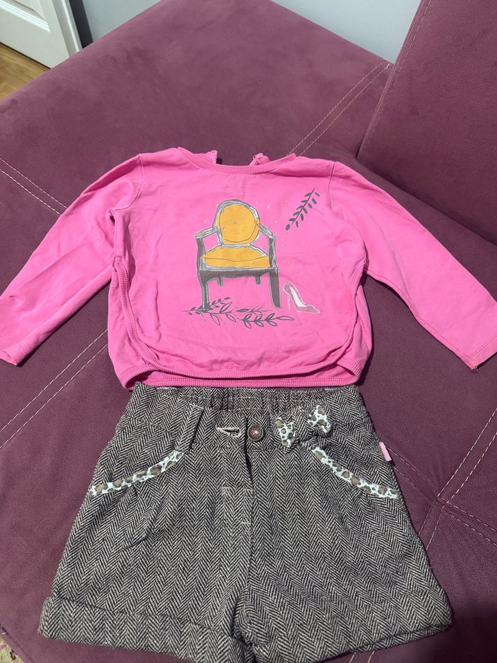 Pembe uzun kollu baskılı üst ve cepleri süslü gri triko şortlardan oluşan bebek kız takımı. 3 yaş için uygun takım
