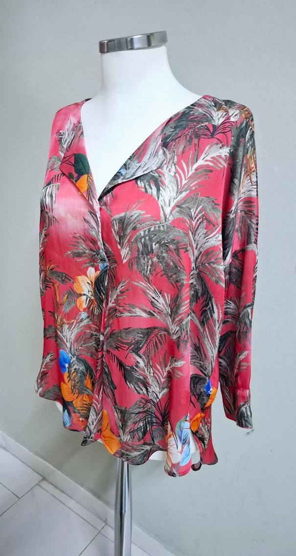 İpek gibi kumaştan, dökümlü ve V yaka uzun kollu bluz. Koyu pembe ve canlı baskılı, bol kesim, midi boyda, bohem tarzda. Ön yüzü kısa arka tarafı Uzun kesim.