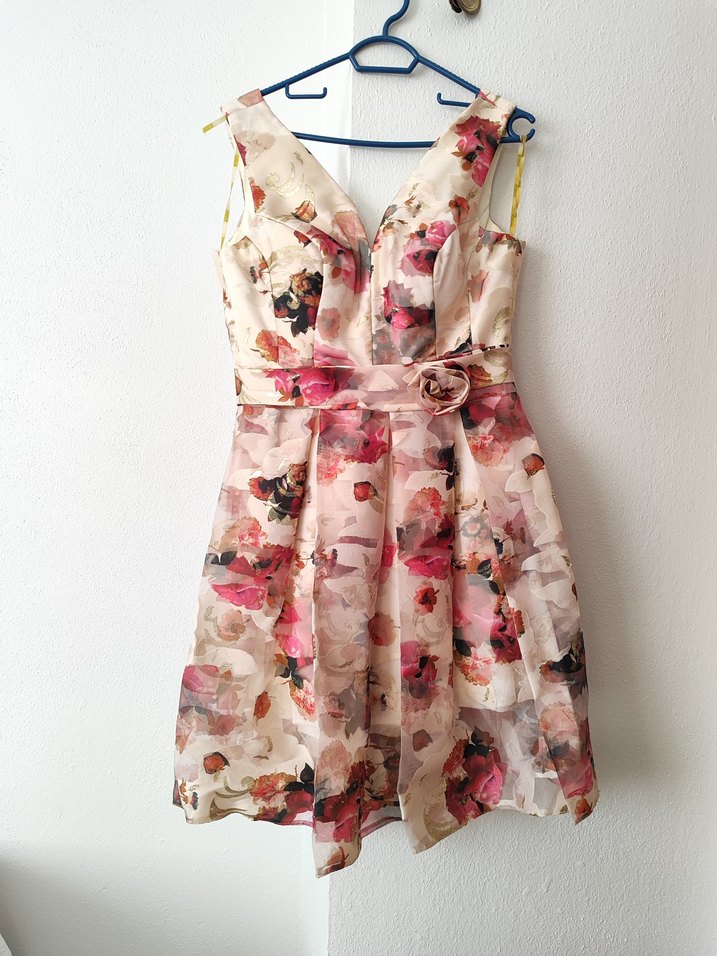 Kolsuz, v yaka, drapeli, pembe pastel çiçek desenli mini kokteyl elbisesi, parti için uygun. sadece bir kere giyilmiştir.